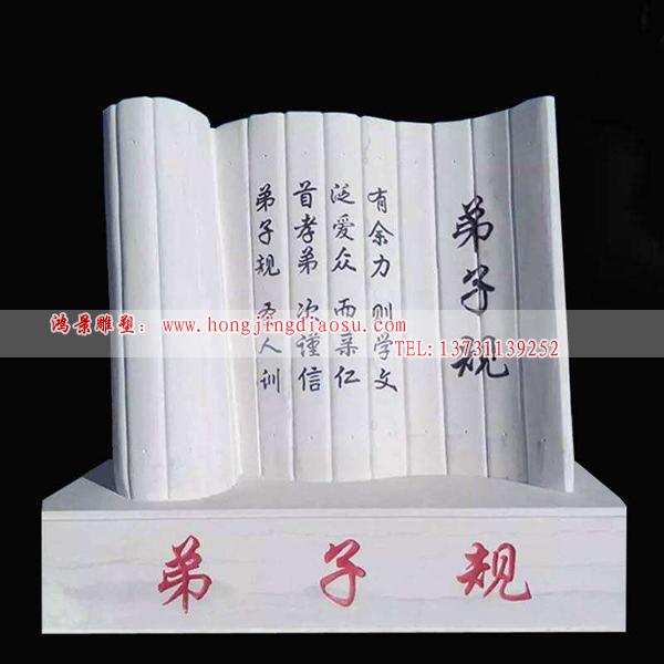 弟子規(guī)雕塑是校園雕塑當中經(jīng)常用到的雕塑,作為校園雕塑首先是具備藝術(shù)、知識兩要素。弟子規(guī)雕塑選用石材,不僅環(huán)保同時看上去美觀。建立弟子規(guī)雕塑這本書是什么寓意呢?弟子規(guī)這本書,是依據(jù)至圣先師孔子的教誨而編成的生活規(guī)范。首先在日常生活中,要做到孝順父母,友愛兄弟姐妹。其次在一切日常生活言語行為中要小心謹慎,要講信用。和大眾相處時要平等博愛,并且親近有仁德的人,向他學習,這些都是很重要非做不可的事,如果做了之后,還有多余的時間精力,就應該好好的學習六藝等其他有益的學問。